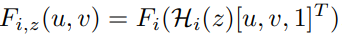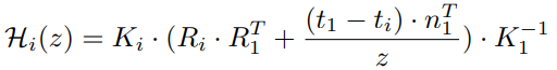 Hi(z)를 추가로 설명하자면, 핀홀 카메라 모델을 표현하는 수식인 K·R·t을 사용해서, 입력 view 이미지를 z번째 sweeping plane으로 변환하는 translation matrix를 계산하는 식입니다. (Intrinsic Camera Matrix인 K, camera rotation matrix인 R, translation matrix인 t를 나타냅니다.)