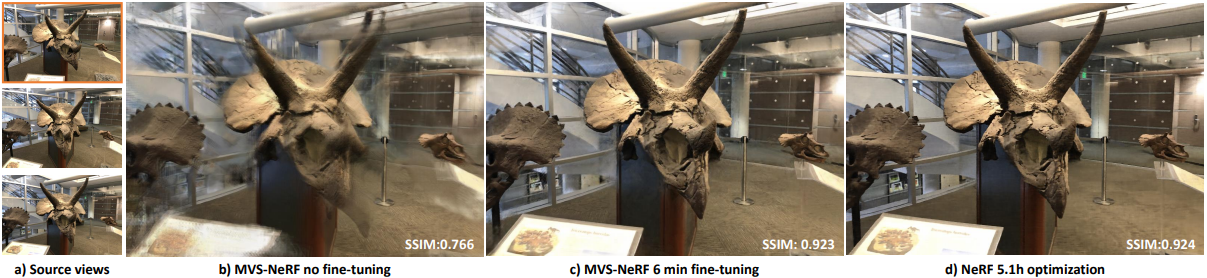 시간에 따른 결과를 비교하였습니다. MVSNeRF가 확실히 수렴속도가 빠르는 것을 볼 수 있습니다.
