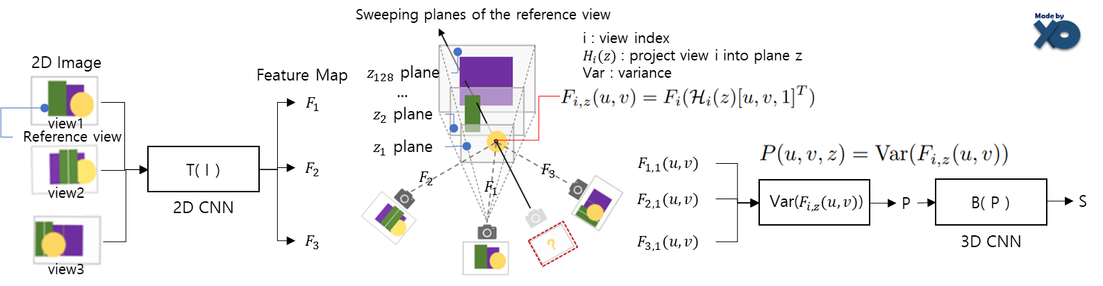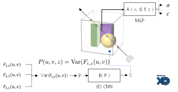Cost volume은 여러 학습 이미지 M 개 view로부터 feature map인 Fi,z(u,v)의 분산(variance)으로 설계 되었습니다.