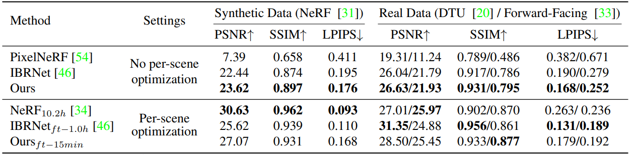 데이터셋 : generalizable network를 학습하기 위해 DTU데이터셋으로 학습했습니다. PixelNeRF(이전 포스트) 의 방법을 따라 512x640해상도를 88:16=train:test scene으로 나누었습니다. 학습데이터와 다른 distribution을 가진 Realistc Synthetic NeRF data와 Forward-Facing data로 모델을 test했습니다. 각 test scene에서 20개 가까운 view를 선택하고, 3의 center view들을 input으로, 13개를 per-scene fine-tuning을 위한 추가적인 input으로, 나머지 4개를 test view로 두었습니다.