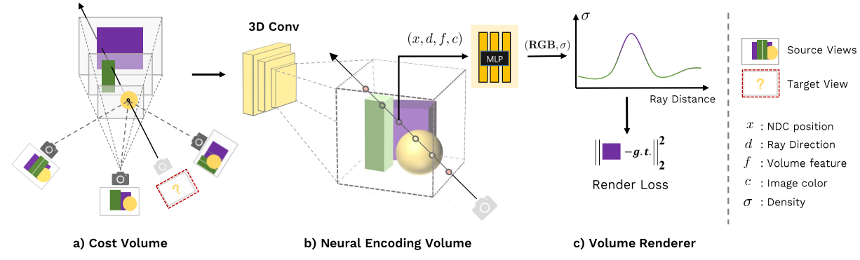 b) Neural encoding volume을 reconstruct하기 위해 3D CNN를 사용하고, radiance field를 표현하기 위해 volume rendering properties를 regress하는 하나의 MLP를 사용하였습니다.