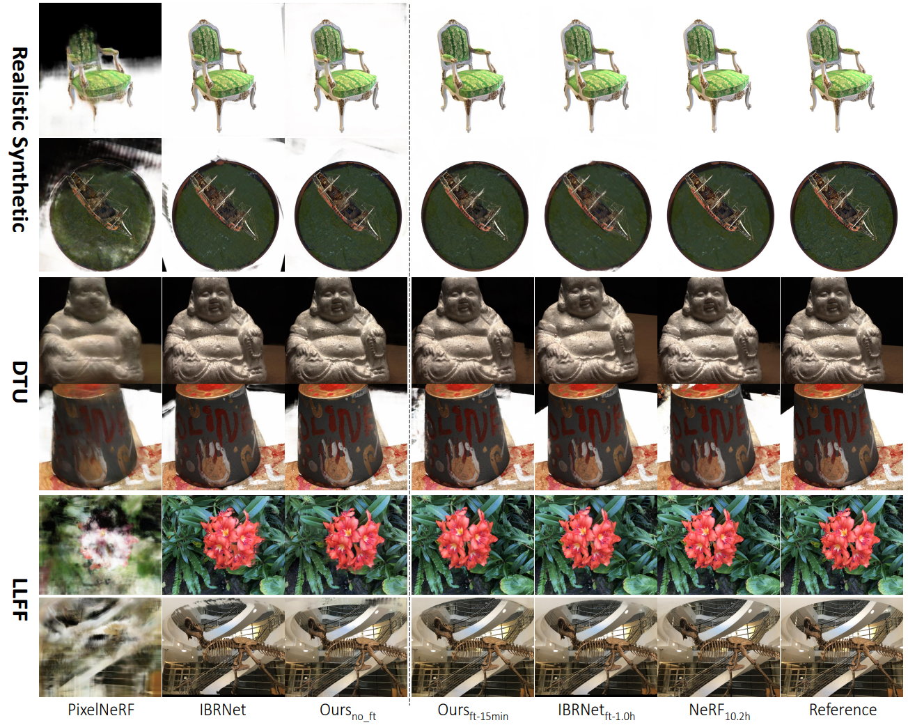 PixelNeRF는 DTU데이터셋에 Overfit되는 경향을 보였습니다. Realistc Synthetic scene에서 obvious artifact를 포함하였고, Forward-Facing scene에서 완전히 fail되었습니다. IBRNet은 다른 데이터셋에서 PixelNerF보다 확실히 성능이 좋았지만, flicker(빛의 깜빡임) artifact가 관측었고, video에서는 더 분명하게 나타났습니다. MVSNeRF는 모든 경우에 더 좋은 성능을 보였습니다. Plane-swept cost volume에서 geometry-aware scene 추론을 위한 MVS 기법을 사용하고, neural encoding volume으로써 localized radiance field representation을 reconstruction하였기 때문입니다.