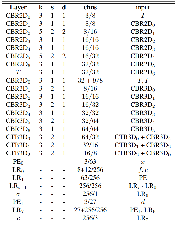 첫행은 2D CNN, 두번째행은 3D CNN, 3번째행은 MLP decoder를 의미합니다. K는 kernerl size, s는 stride, d는 kernal dilation, chns은 각 layer의 input/output 채널을 의미합니다. CBR2D/CBR3D/CTB3D/ LR/PE 는 ConvBnReLU2D/ConvBnReLU3D/ConvTransposeBn3D/ LinearRelu/Positional Encoding을 의미합니다.