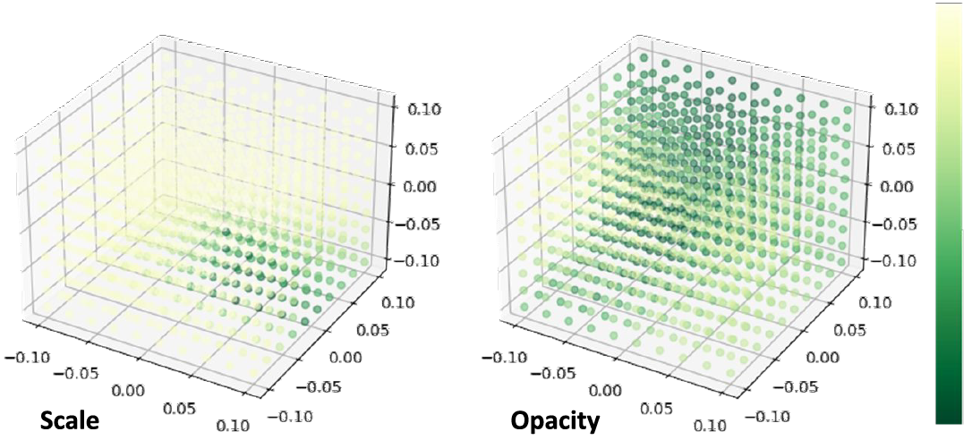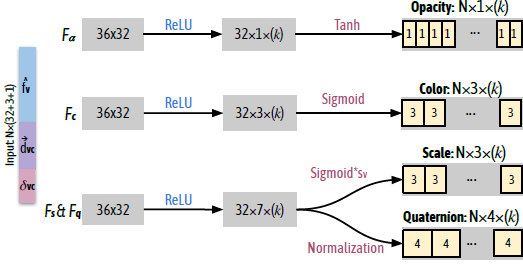 다른 Parameter인 opacity, color, scale, quaternion는 MLP를 통해 출력하도록 설계됩니다.