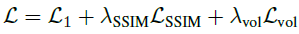 rendering한 pixel color 에 대해 학습 이미지에 대한 차이를 L1 Loss와 SSIM Loss 로 계산하고 추가적으로 volume regularization Loss를 사용하고 있습니다.