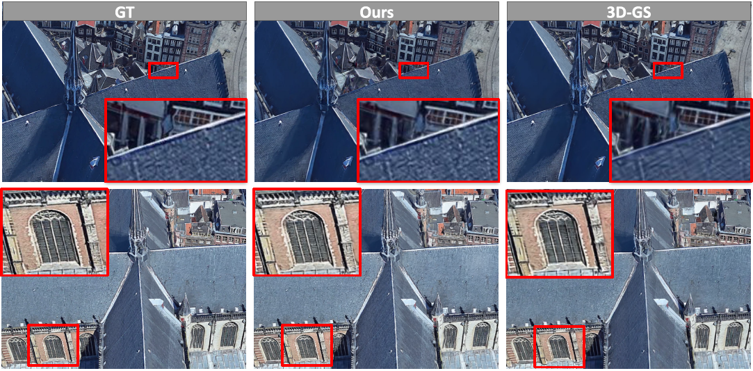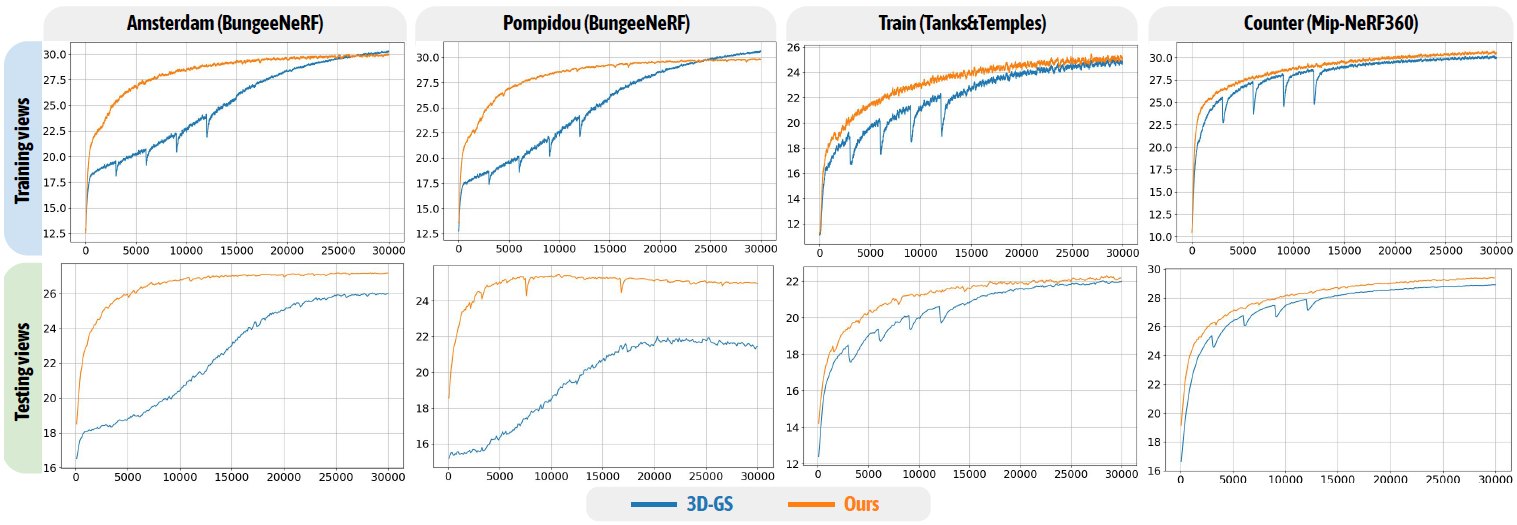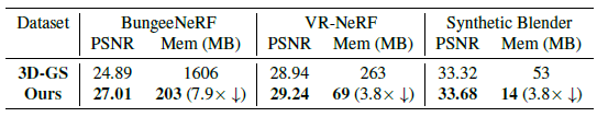 multi-scale 로 구성된 scene 인 BungeeNeRF 데이터셋과 VR-NeRF 데이터셋의 경우 3D-GS에 비해 높은 퀄리티 개선이 있었습니다.