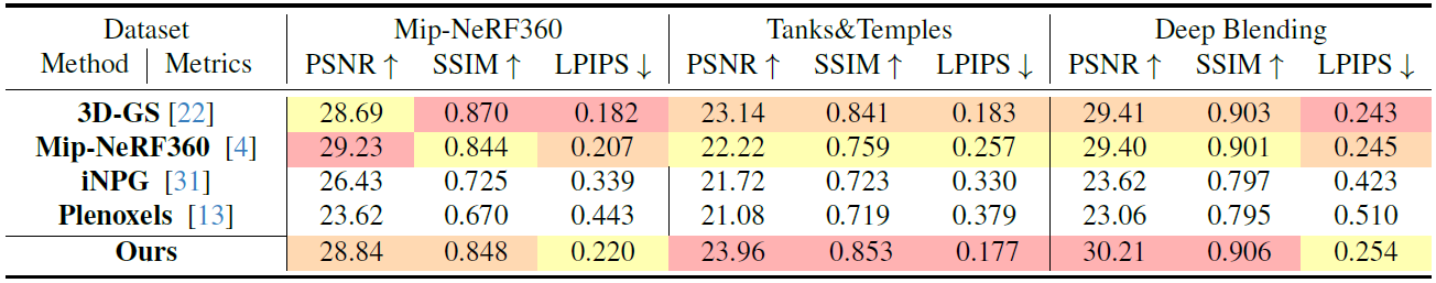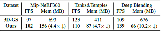 데이터셋별 퀄리티 평가입니다. 3D-GS와 소수점 단위의 차이를 보이기에 퀄리티 관점에서는 유사합니다.
