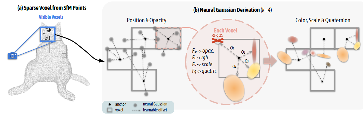 - Neural Gaussian Derivation : anchor point를 기준으로 해서 주변 gaussian을 예측하는 MLP모델을 만듭니다.