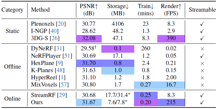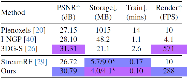 - StreamRF는 Plenoxels를 사용해서 장면을 표현하고 최소한의 저장 공간으로 빠른 실시간 학습을 했습니다. StreamRF는 몇 초만에 각 프레임의 학습을 완료하고 압축된 모델로 저장하지만, 렌더링 속도는 부족합니다.