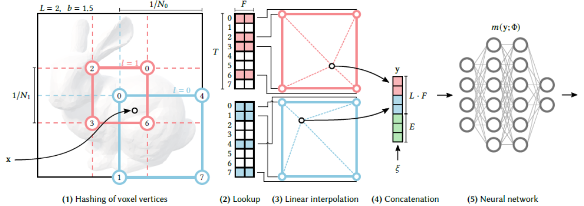 위 Instant-NGP를 복습하자면, 이미지 plane의 각 pixel은 view direction으로 ray를 그리고 ray위에 point 좌표를 샘플링합니다. 해당 샘플링된 좌표값은 multi-resolution으로 구성된 grid의 인접 voxel을 참조하게 되는데, 이를 voxel좌표를 hash table로 구성하며, 샘플링된 좌표는 voxel좌표들의 hash key값인 feature vector들로 interpolation되고 이 값을 MLP에 통과시켜 color와 opacity를 획득합니다. 이러한 방법을 통해, 메모리를 절약하면서 빠르게 수렴하도록 만들었었습니다. 자세한 내용은 이전글 참조 바랍니다.