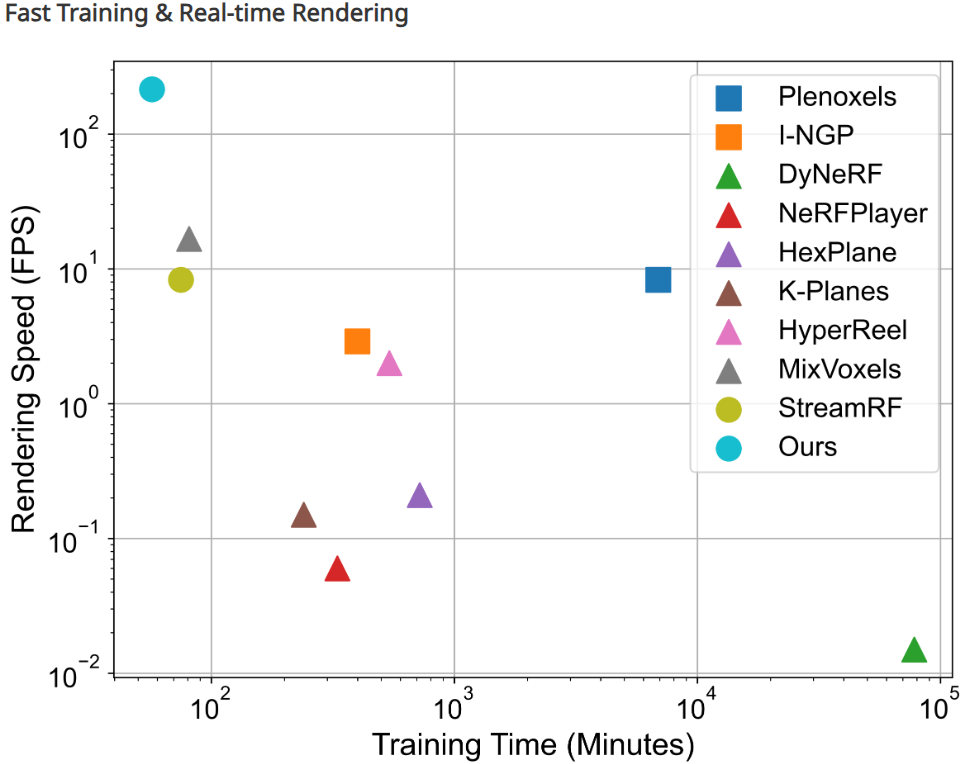 Free-Viewpoint Videos(FVVs)를 생성하는 연구입니다. 풀어쓰자면, 고정된 카메라 위치에서 촬영한 Video들을 학습해서, 다양한(=자유로운) 카메라 위치에서 Video를 생성하는 연구입니다. 기존 연구 대비 상당히 빠른 속도로 학습한다는 것을 강점으로 내세우고 있습니다.