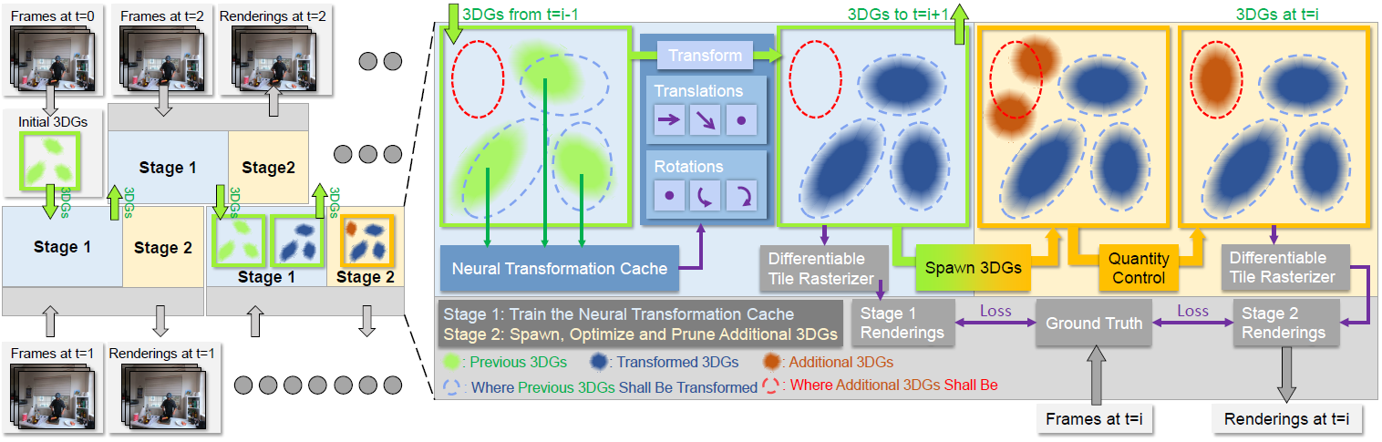 Stage 2: 이전 frame에 없었던 물체의 경우 추가적인 Gaussian을 생성해줍니다. 주황색 바탕에 해당하며, Adaptive 3DG Addtion라고 합니다.