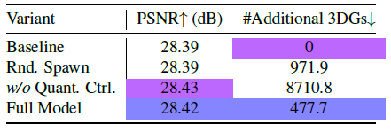 baseline은 stage1만 적용한 경우이고, Rnd. Spawn은 random으로 Gaussian을 추가하였을 경우, w/o Quant. Ctrl은 quantity control strategy를 적용하지 않았을 경우를 보여줍니다. PSNR의 경우 큰 차이는 없으며, w/o Quant. Ctrl의 경우 필요하지 않는 많은 갯수의 Gaussian을 생성하는 것을 볼 수 있습니다.