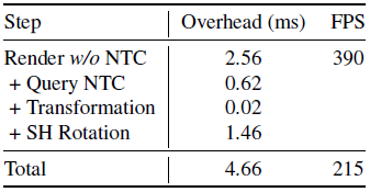 3DGS모델을 그대로 쓴 경우 2.56ms가 소요되고, NTC, Transformation, SH Rotation각각을 적용했을 때의 추가 시간을 표기하였습니다. SH Rotation의 경우 가장많은 시간이 소요되는 것을 볼 수 있습니다. 3DGS 랜더링을 그대로 썼을 경우 390FPS이고, 본 연구 기법을 모두 적용했을 때 215FPS임을 볼 수 있습니다.