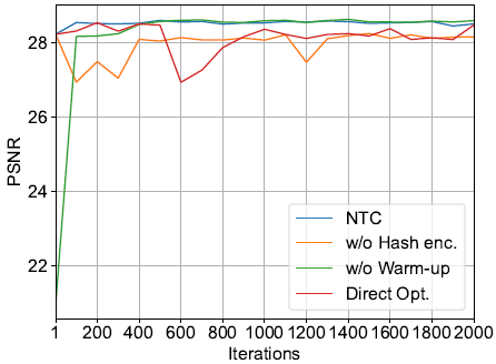 NTC를 모두 적용한 경우, hash encoding을 뺀 경우, warm-up loss를 뺀경우, 이전 frame의 3DGaussin을 직접적으로 optimization 한경우에 대해 각가 실험 한 결과입니다. stage1의 경우 150iteration을 한다고 되어 있는데, 2000 iteration까지 수행해 본 것으로 보입니다. hash encoding이 없는 경우 성능 하락이 큰 것을 볼 수 있습니다.