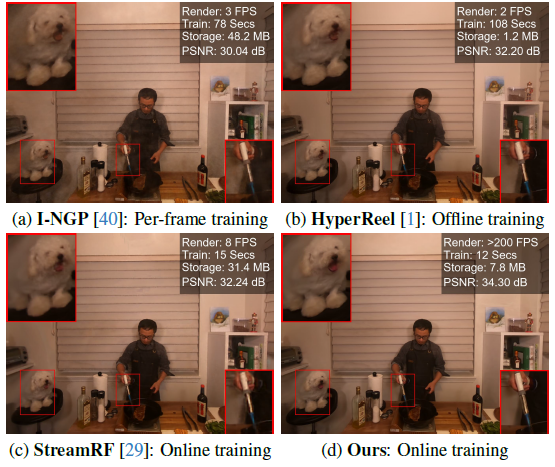 - ReRF와 Dynamic#DGS는 적은 수의 객체와 foreground mask가 있는 scene만 처리 할 수 있으며, 학습 시간이 몇 분 걸립니다.