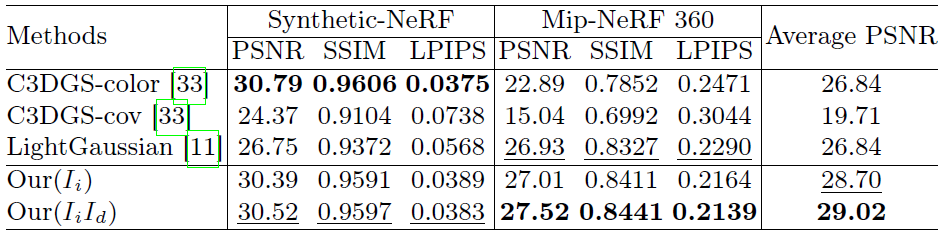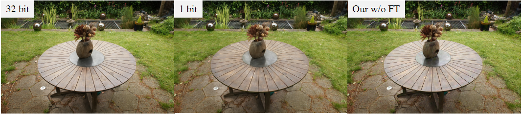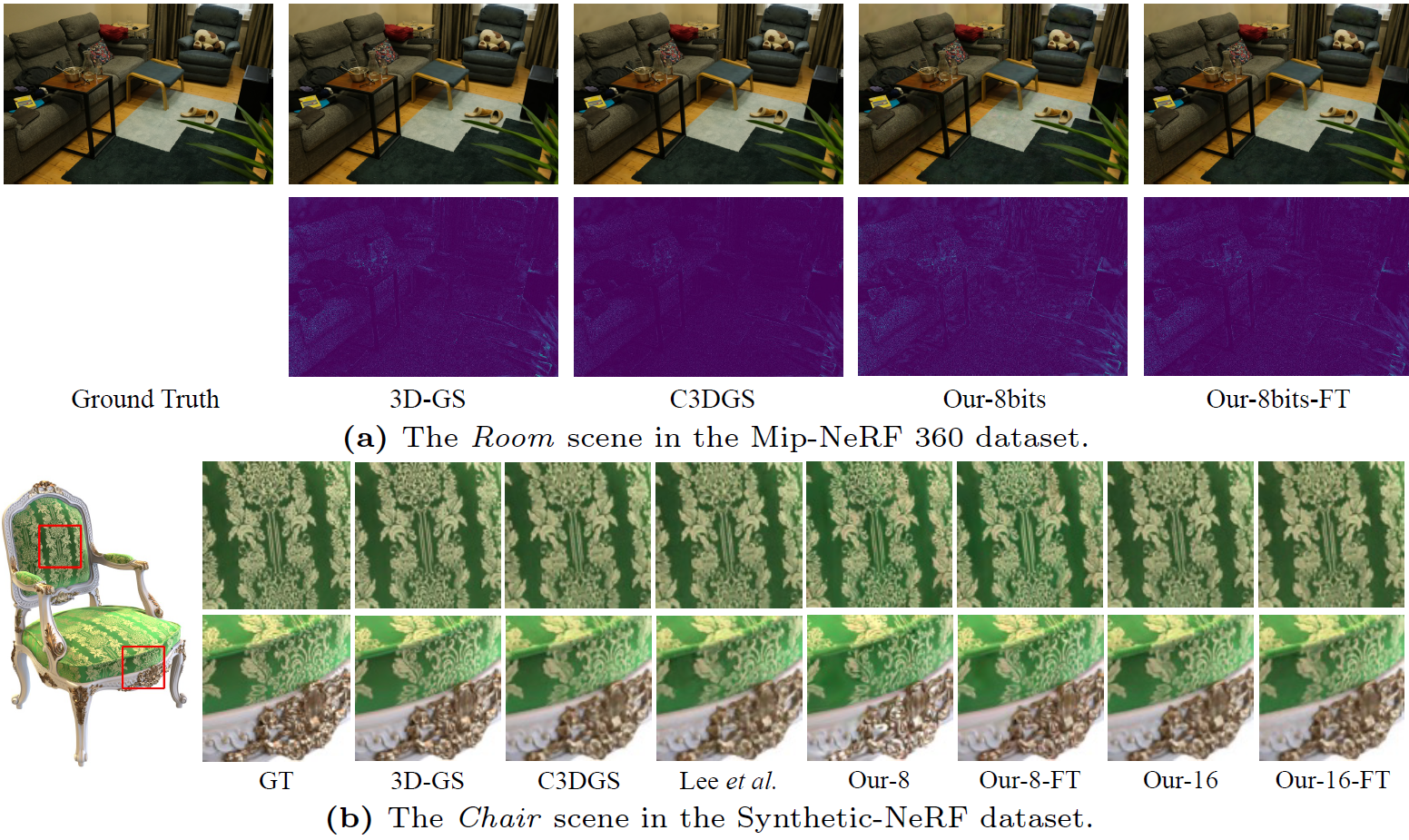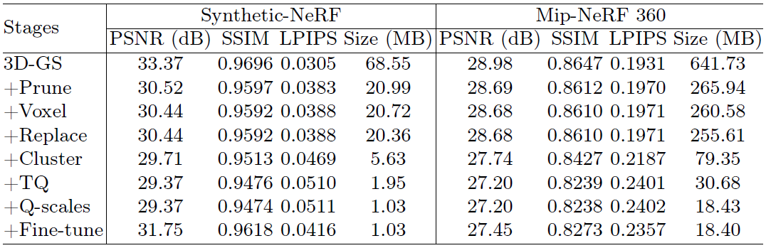 3D-GS 대비 랜더링 퀄리티는 약간 감소하고, 모델 사이즈는 확연히 줄였습니다. compression 다른 연구인 C3DGS대비, 랜더링 퀄리티는 약간 향상하고 사이즈도 약간 줄였습니다.