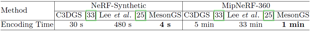 compression을 위한 encoding시간을 비교하였을 때, 본 연구(MesonGS)가 빠르게 encoding되는 것을 볼 수 있습니다. 해당 결과는 finetuning을 하지 않았을 경우라고 합니다. Gaussain의 갯수가 2만개 이하일 경우엔 CPU에서도 빠르게 encoding 할 수 있었다고 합니다.