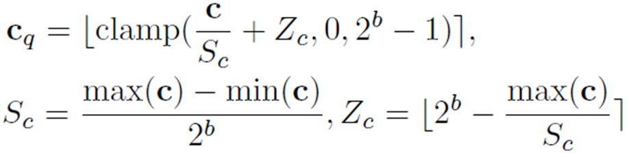 b는 bit-width이고 Z의 [ ] 부호는 반올림 (rounding-to-nearest)하고 clamp()는 min값이하를 min으로 만들어주고, max값이상을 max로 만들어주는 수식을 의미합니다. 블록내 값을 제한하여 양자화 오차를 줄일 수 있다고 합니다. c는 양자화 전 attribute이고 $c_q$는 양자화된 attribute입니다. 8bit로 양자화 할 때, scale vector는 exponential 형태라 오차를 크게 확대 시키기 때문에 scale vector의 경우 양자화 하지 않는다고 합니다.