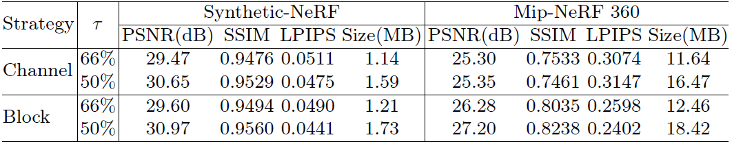 타우는 pruning threshold를 의미합니다. 타우가 작아지면 가우시안갯수가 많아지므로 모델크기는 커지고 퀄리티도 좋아집니다. block quantization의 경우, 모델크기는 커지면서 PSNR이 향상되는 것을 볼 수 있습니다.
