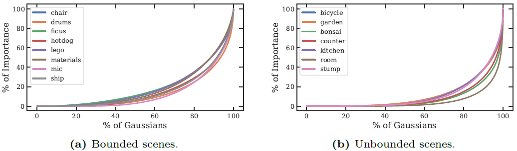 저자가 실험해봤을 때 Gaussian의 약 40%가 전체 중요도(=$I_g$)의 80%이상을 차지하는 것을 확인했고, Gaussian을 제거해도 랜더링 품질을 유지 할 수 있었다고 합니다.