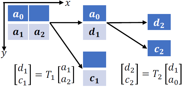 RAHT는 3D Point Cloud를 압축하는 "Compression of 3d point clouds using a regionadaptive hierarchical transform, 2016" 연구에서 제안된 방법입니다. Octree 형태의 구조에서 (위에서 언급한) gaussian importatnt attribute들을 coefficient형태로 바꿔서 압축합니다. coefficient는 하나의 direct current(DC)와 여러개의 alternating current(AC)로 구성됩니다. 논문에선 이를 어떻게 적용하는지 (3차원이 아닌) 2차원 예시로 설명하고 있습니다.