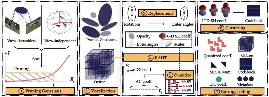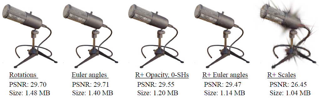 ③ Replacement : 3D-GS를 구성하고 있는 parameter의 크기를 줄입니다. 3DGS의 Gaussian rotation 쿼터니언 표기법을 Euler angle표기법으로 변환하여 줄 일 수 있고, opacity, SH coefficient 등에 중요하지 않은 값들을 분류합니다.