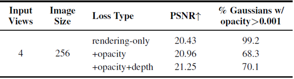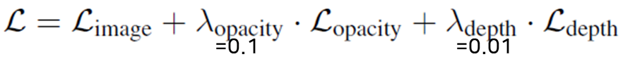 Rendering Loss를 기본으로 Depth, Opacity Regularization Loss를 적용합니다.