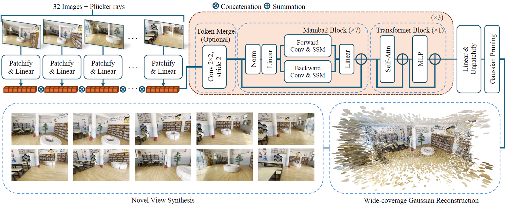 32개 이미지를 입력받아 Mamba2+Transformer 구성된 네트워크로 3D Gaussian Paramter를 출력하도록 설계됩니다.