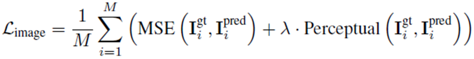 시각적인 pixel의 차이를 계산하는 Mean Squared Error(MSE) Loss부분과, LPIPS처럼 학습된 VGG에 이미지를 넣고 output vector의 차이를 계산하는 Perceptual Loss로 구성되어 있습니다. λ는 0.5입니다.
