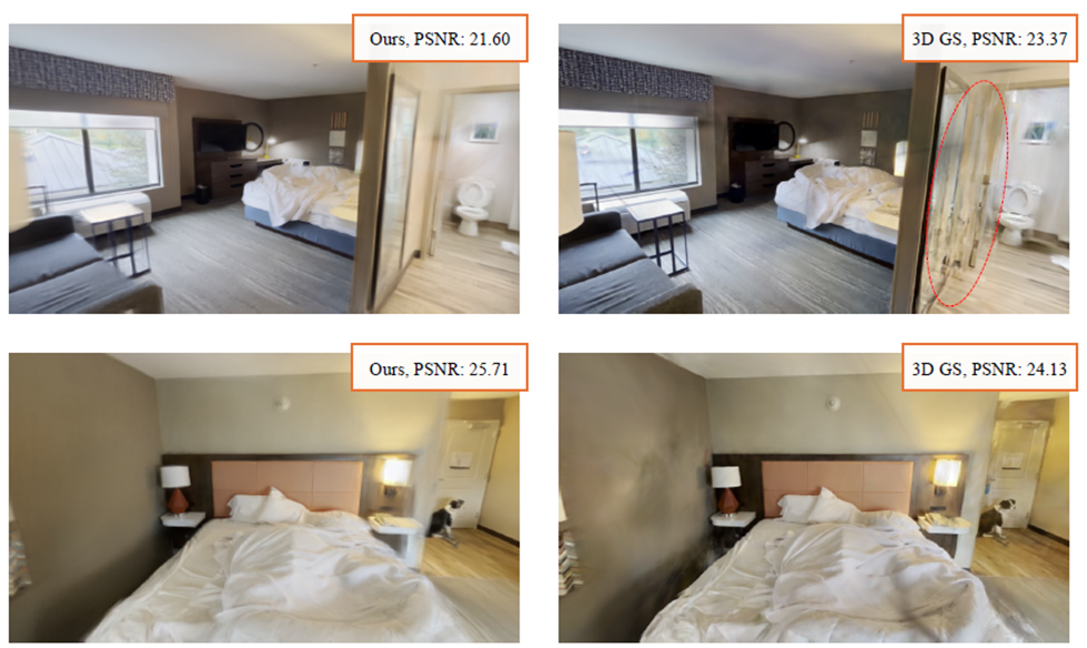 regularization을 통해, floater들을 많이 제거하게 됩니다. 전체 Gaussian 중에 약30% Gaussian이 사라지게 되는 것을 볼 수 있는데, 이부분이 PSNR을 향상시키는 요소로 작용하는 것을 볼 수 있습니다.