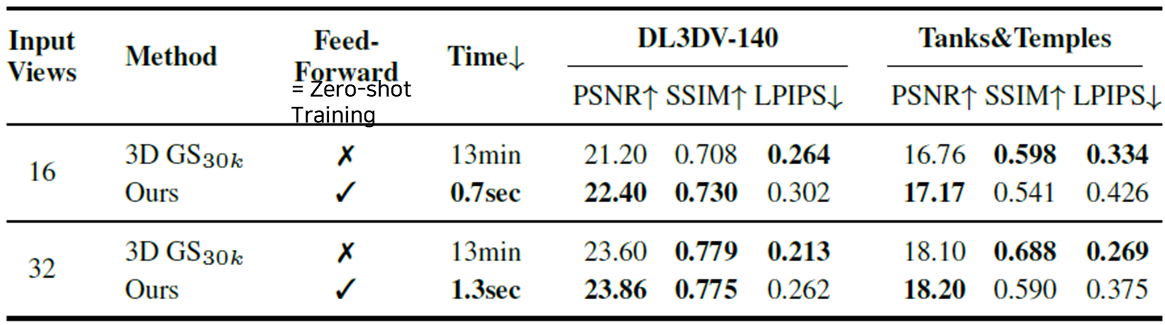 feed-forwrad는 zero-shot training을 했는가에 대한 내용입니다. 기존 3DGS에 비해 학습속도를 600배 이상 단축시키고, 퀄리티도 유사한 수준임을 볼 수 있습니다.