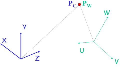 때문에, 같은 위치라도 좌표계에 따라 다른 좌표 값을 갖게 됩니다. 아래 그림에서 Pc는 Camera Coordinate System에서의 좌표값, Pw는 World Coordinate System의 좌표값을 나타내며, 다른 값을 가집니다.