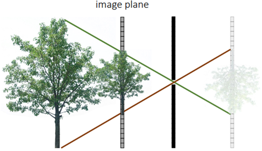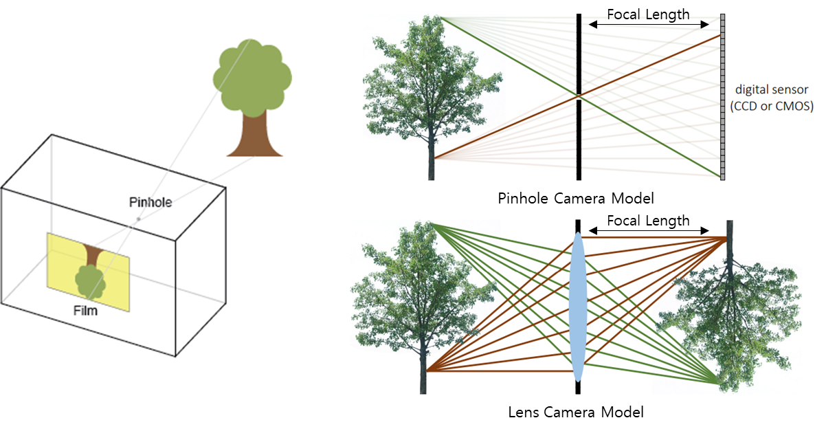 Pinhole Camera model은 가장 초기 카메라에서 사용된 모델이며 영상처리 분야에서 기본적으로 사용되는 모델입니다. Pinhole을 통해, 외부의 빛을 받아들이고, 카메라 내 digital 센서로 빛을 인식합니다. 이 때 상은 상하반전, 좌우 반전되어 맺히게 됩니다. Pinhole같은 경우에는 빛을 많이 받아들이지 못하게 때문에 사용하지 않고, 최근에는 빛을 더 많이 받아들 일 수 있는 Lens Camera Model을 사용합니다. Pinhole과 sensor사이의 거리, lens와 sensor사이의 거리를 focal length라고 하는데, 위 그림에서는 focal length가 아주 큰 영역으로 표현되어 있습니다. 하지만 실제적으로 아주 작은 영역입니다. 찾아보니 아이폰12의 경우 13mm네요. 왼쪽 영역에 대해서는 카메라로 나무 촬영할 때 얼마나 떨어져서 촬영하는지를 생각해보면 될 듯합니다. 4M정도 되려나요?