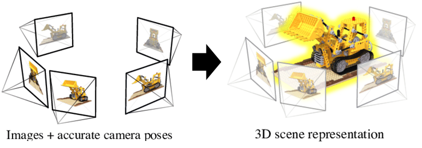 3D Reconstruction 분야에서도, 여러 카메라 위치에서 Pose가 주어진 이미지들을 3D 공간상으로 Optimization하기 위해서, Camera Parameter가 중요하게 사용됩니다. 아래는 BARF: Bundle-Adjusting Neural Radiance Fields 연구에서 NeRF를 설명하는 이미지입니다.
