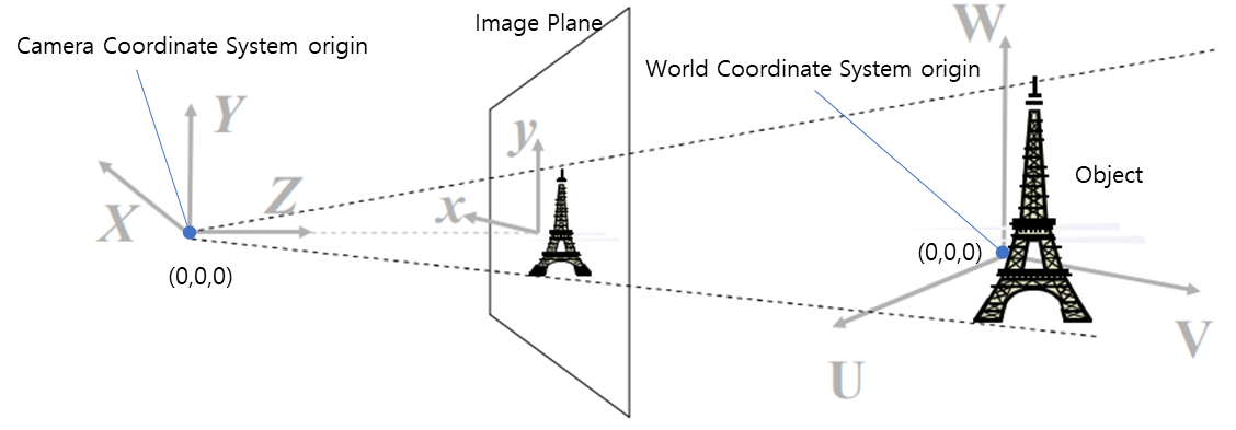 다양한 coordinate(좌표계)의 관계를 설명하기 위해 사용되는 좌표계입니다. World coordinate는 1개의 임의의 origin(원점)이 정의됩니다. 위 그림에서 U, V, W에 해당합니다. 이를 통해 다양한 위치의 카메라 좌표계들은 이 좌표계를 기준으로 서로의 관계를 나타낼 수 있습니다.