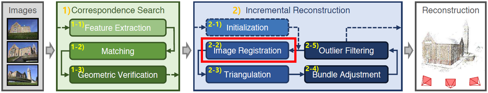 - reconstruction 단계에서 scene structure의 누락이나 부정확성 때문에 image를 regiser하지 못하기 때문에 발생할 수 있습니다. 이미지 registeration과 triangulation은 의존 관계를 갖고 있습니다. 이미지는 형성된 scene structure에만 registeration 할 수 있고, scene structure는 registered된 이미지로부터 triangulation 할 수 있기 때문입니다.