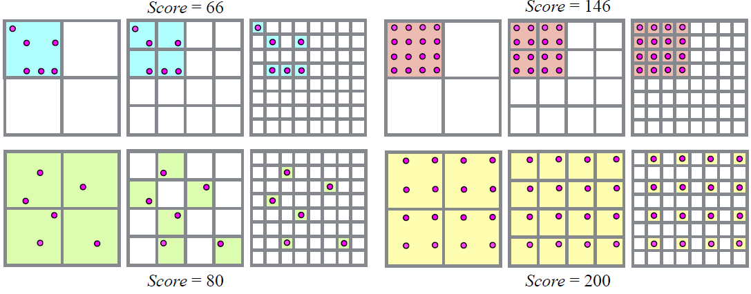 - 하지만 visible point 갯수 $N_t$가 cell의 갯수 $K_l^2$보다 훨씬 적다면, point 분포를 알기가 어려울 수 있습니다. 때문에 grid를 나누는 갯수를 $K_l = 2^l$로 두고 level l을 1부터 정수 L 증가시키면서 이미지를 서로 다른 크기의 cell로 나누는 방법을 사용했습니다. 이를 multi-resolution 기법이라고 하며, 모든 level의 score값을 더해서 visible point가 얼마나 분포 됬는지를 수치적으로 효율적으로 계산 할 수 있게 했습니다. 아래는 예시입니다.