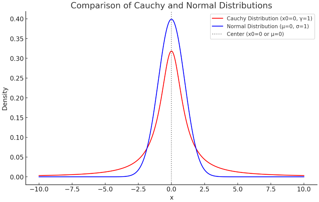 빨간색 곡선 : $x_0 = 0$, $\gamma = 1$인 표준 Cauchy 분포(Standard Cauchy Distribution)입니다. 위치 $x_0 = 0$를 기준으로 대칭이며 $\gamma = 1$로 인해 폭이 더 좁습니다.