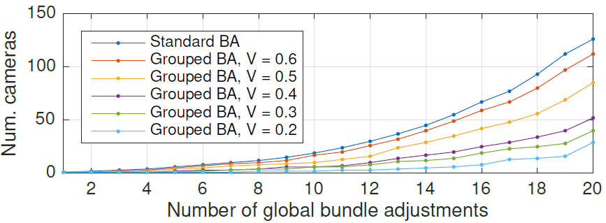 밀집하게 분포된 이미지들의 순서 없는 컬렉션에서 중복 뷰 탐색을 평가했습니다. 위 그림은 고정된 BA 반복 횟수를 사용하는 경우, 전역 BA에서 파라미터화된 카메라의 growth rate을 보여줍니다. scene overlap 비율 V에 따라, reduced 카메라 시스템에서 BA 수행 시간을 크게 줄일 수 있습니다. 전체 실행 시간의 유효 속도 향상은