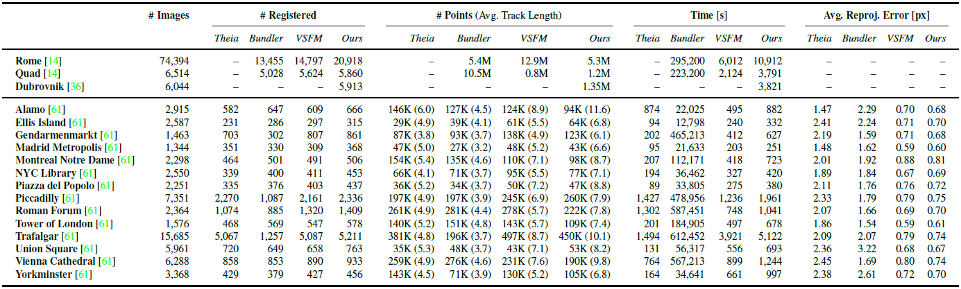 Theia는 가장 빠른 방법이며, 본 연구는 VisualSFM보다 약간 느린 시간이 소요되지만 Bundler보다는 50배 이상 빠릅니다.