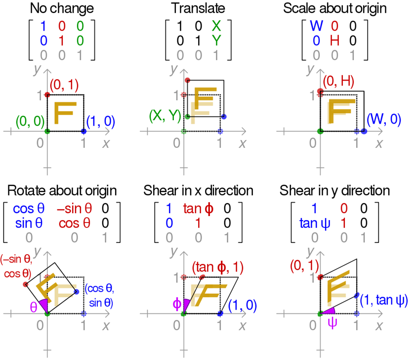 수식을 설명하기 앞서 Transformation Marix 기본을 살짝 언급하자면 아래와 같습니다. 3차원도 동일하게 적용됩니다. 2행만 수식에 사용되지만 행렬 연산을 위해서 정방행렬이 되어야 하기 때문에, [0, 0, 1]이 마지막 행에 붙습니다.