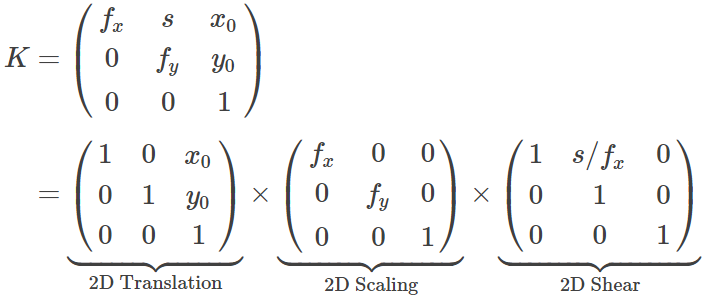 앞에서는 3D공간내의 카메라 Pose와 관련되었다면, Intrinsic Parameter는 Pinhole 카메라 위치가 고정된 상태에서, 카메라 Focal Length(fx, fy), Principal Point의 위치(x0,y0)를 변화시키는 내부 Parameter와 관련이 있습니다. Extrinsic Parameter를 통해, World좌표계에서 Camera좌표계로 변환이 됬다면, Intrinsic Parameter는 Camera 좌표계에서 Pixel 좌표계로 변환하는 것에 대한 것입니다. 2D Translation, 2D Scaling, 2D Shear Matrix로 구성되어 있고, 각 Matrix에 대해 다뤄보겠습니다.