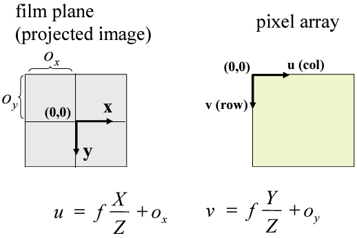 앞서 본 Principal Point을 기준으로 offset값을 주게되면 Image 좌표계에서 Pixel 좌표계로 변환이 됩니다. Translation Matrix를 통해 ox, oy만큼 이동이 가능합니다. 아래 수식에선 x0, y0에 해당됩니다.