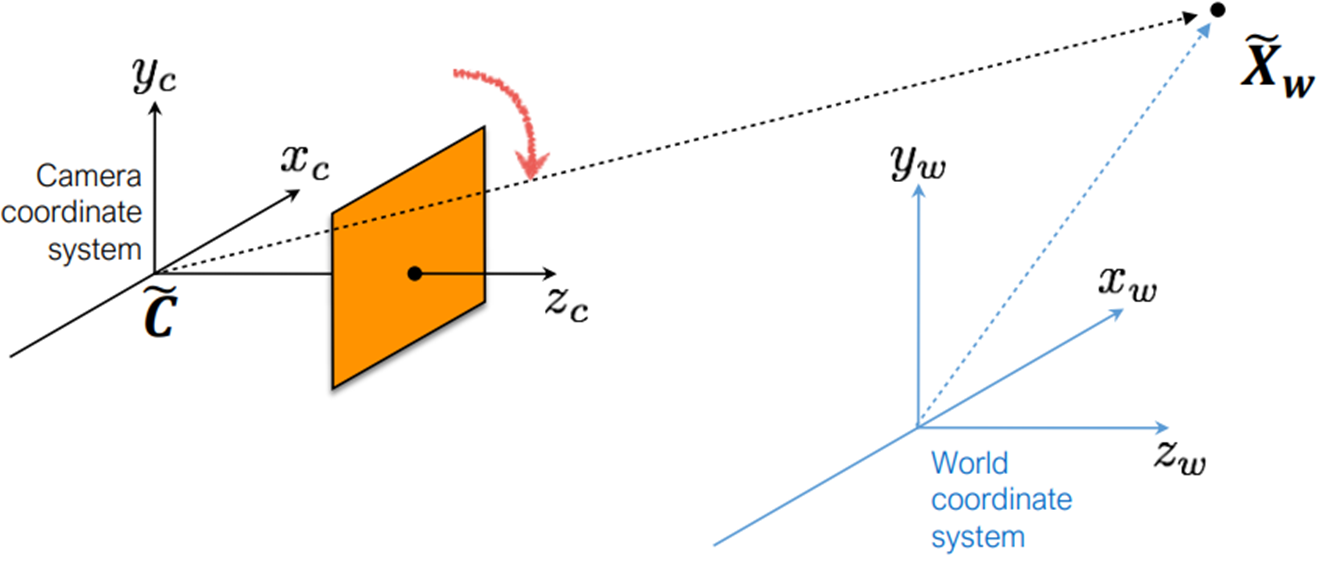 Xw라는 world 좌표계내의 점을 Camera좌표계로 이동하기 위해, World좌표계의 내에서 Camera좌표계의 Origin위치인 C만큼을 빼주고 (1번째 그림), 카메라 포즈 Rc Matrix를 Transpose한 Matrix(=R)로 회전합니다(2번째 그림).