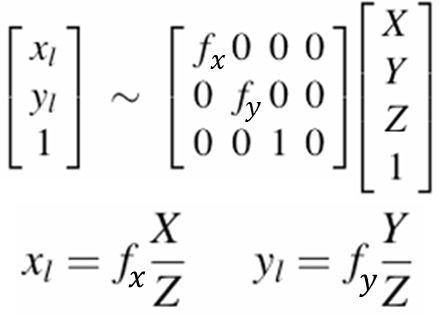 3D좌표를 2D로 변환하는 수식이며, x,y는 2D 좌표, X,Y,Z는 3D좌표입니다. 3x4에 4x1 matrix가 곱해지면 3번째 값이 Z가 되는데, 좌측항에 1을 만들어주기 위해 Z를 나누주게 됩니다.