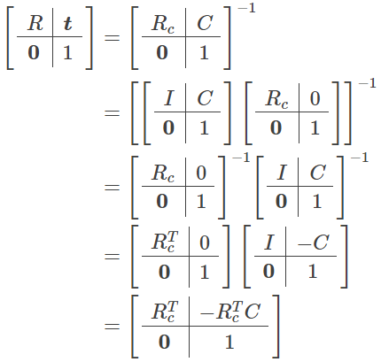 C는 World 좌표계 내에 카메라의 위치를 나타내고, Rc는 World좌표계의 Axis(축)을 기준으로 카메라의 방향을 나타냅니다. 단순하게 원점만 생각하면 t=-C 가 아닌가?라고 생각할 수 있는데, 축이 회전 되기 때문에 Rotation도 고려가 되어져야 됩니다. R은 Rc의 Transpose가 되고, t는 -R*C가 됩니다.