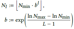 소문자 엘(=l)은 level을 나타내어, 0번째 level에서는 Nmin, 1번째 level에서는 Nmin*b^1 계산 후 내림한 값입니다. Nl은 l번째 level의 Resolution을 나타냅니다.