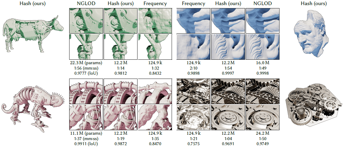 비교대상 논문은 NGLOD (2021)입니다. trainable feature vector를 Octree로부터 갖고 와서 MLP의 입력으로 사용하는 방식으로 속도와 퀄리티를 향상시킨 최신 기법입니다. (Octree개념은 Octree 이전글 참조) 본 연구 기법은 NGLOD와 유사한 performance와 memory cost를 보였습니다. Shading모델을 사용해서 SDF를 Visualize하였을 때, 일반적으로 color들은 약간의 변화에 민감하지만, Color들을 직접적으로 prediction하는 기존 방법론들 보다 본 연구 기법이 좀 더 강인한 것을 보였습니다. 자세히 보면 NGLOD에 비해 Hash방법의 표면이 거친 것을 볼 수 있는데, NGLOD는 Collision방지가되어 있기 때문에, Hash방법은 Hash collision영향으로 인해 발생됬다고 보고 있습니다.
