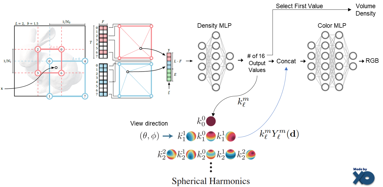 논문에 써져 있는 내용으로 제가 추측해서 도식화 하였습니다. 16개 output의 첫번째가 density가 된다는게 이상했는데, Spherical Harmonics의 첫번째 Yml값은 입력 view direction에 관계없이, 항상 같은 값을 갖기 때문에 coefficient를 Volume Density를 사용하는 것 처럼 보입니다. 추측입니다. 첫번째 Yml값에 대해서는 PlenOctree 이전글을 참조바랍니다.